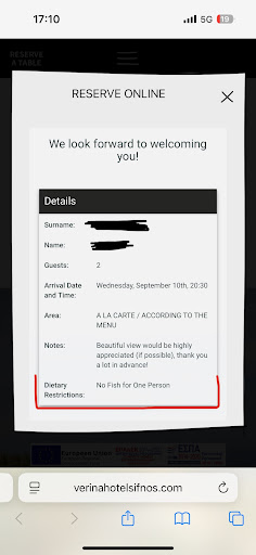 Long story: We booked a table online, and due to the short notice, confirmation via WhatsApp was fast. We added in the field „dietary restrictions“ that one of us doesn‘t eat fish. We got a great table with a beautiful view and were approached by a young waiter(1) handing us the menu and asking for allergies. We confirmed that one of the guests did not eat fish. It was not an allergy but personal preference. Other than expected, the „a la carte“ menu was different than the one in their website. Instead of waiter 1 showing up again, it took ages and waiter 2 showed up and explained that the menu online was from last year. Anyway. We ordered inter alia bread and butter. Waiter 3 brought the starters, while waiter 4 collected the plates afterwards. While finishing the bread I wondered what “Bottarga” was, googled it, and found out it is fish roe. It was the orange stuff on the butter. I confronted waiter 4 who started to argue a bit but also wanted to double check it with her colleagues. Waiter 1 arrived again to ask again if it’s a personal preference or allergy and then told us they only remove things if it’s an allergy. We once again pointed out it was also written in the dietary restriciton with our reservation. Waiter 1 then tried to explain that fish roe (Bottarga) is not fish, just a product from the fish and we are wrong. We’re still shocked that a waiter tries to explain to a lawyer that something that is cut out of the fish’s belly is not fish.