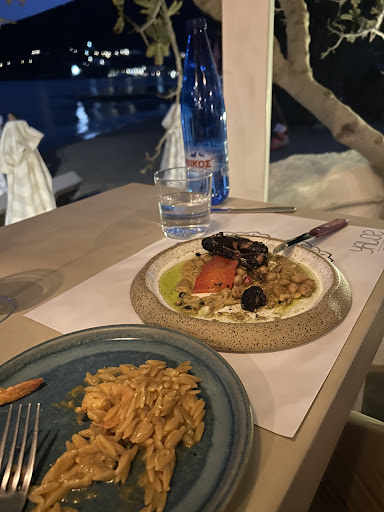 Very popular beach side spot for the pre & post wedding crowds, and well heeled island hoppers with an unlimited travel budget. Thankfully, the restaurants on this strip kindly leave out menus for passers by to check out in advance - sparing any embarrassment should you take a table blind. Expect to pay €100 for 2 sharing three dishes and a reasonably priced bottle of wine & tip. Daily fish specials will trigger that beyond €100. The welcome is warm and attentive, service is excellent and the food both inventive and utterly delicious. We both could have easily ordered our food twice (not on account of portion sizes, just for being so bloody good). The wine list is tempting and of Greek provenance - which is really heartening to see. We chose a bottle of Sauvignon Blanc for €34.00, which was delicious and a perfect match for our dishes. Some might consider the place pricey, but the standard of cooking and simple creativity make this an easy choice if you want to break away from the traditional charcoal grill tavernas - and splash out on something special. A star has been culled for the music (sorry). Chill out cover versions played on Spanish guitar and keyboard with Prozac vocals should be consigned to the bin forever. Otherwise, 5 stars. Ate September 6th 2022. Addendum: Returned for another exceptional supper September 12th and the choice of music was waaaay better. Fifth star has...