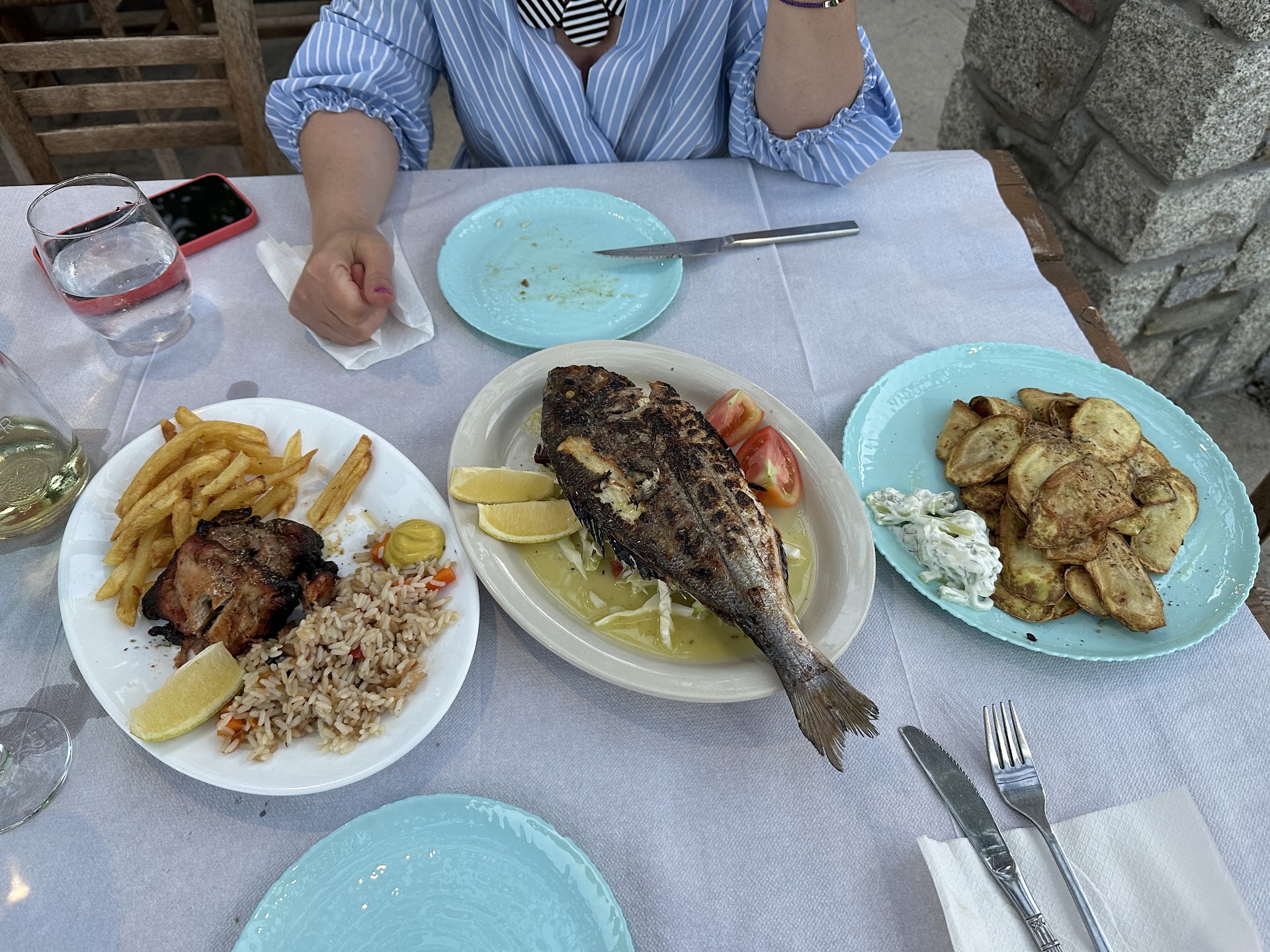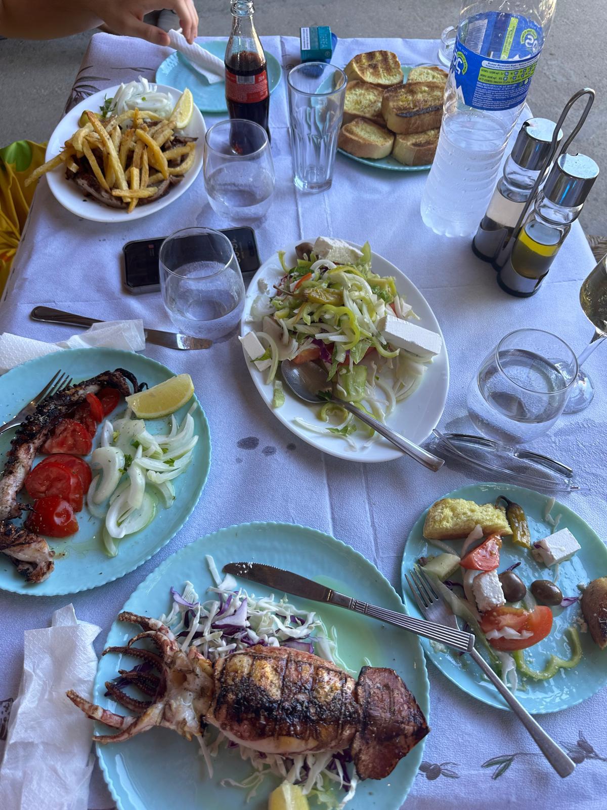 What a treat! What an amazing place to have dinner at! With no exaggeration, it's top two ever for a seaside restaurant experience! The food is delicious and the portions are huge. The Greek salad portion feeds two people, especially if you have a main dish. The grill chicken is super big, it feeds a family of four easily, with leftovers to pack 😀 (17€). Portions come with potatoes included. And now, the atmosphere... ❤️😀 You want Greek!? You'll get Greek! A spacious terrace shaded by old grapevines in fruit, hanging on stone pillars. The background music is Greek, with the volume set for elegant, quiet discussions. If I wanted a romantic dinner in a Greek setting, this is the place I'd always go to. It's not on the front beach, it's not super fancy, it's not show off pricey, but to me, it's the best place I've been in since in Greece! And two more review points, a good one, and a black point: the waiters are always smiling and kind; on the other hand, they have no draught beer🍺😢. But the bottled ones are Mythos and Alpha, and at a very reasonable price, too, like all the food on the menu, compared to other tavernas around or in Kalamitsi. I can hardly wait to go back, today...