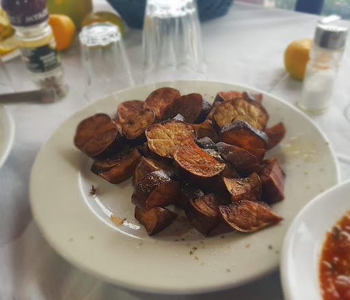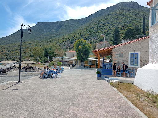 Small restaurant with blue coloured walls and fresh flowers on the tables. There isn't any apparent signboard, it's placed between Eucalyptus bar and Dolphins restaurant in the harbour. The entrance fee (the food and drink Greeks always put on your table, no matter you need them or not): 2,25€ bread, 1€ water. We tried saganaki [fried cheese] 4€, mixed salad [fresh tomatoes, cucumbers, lettuce, a handful of olives with balsamic and olive oil dressing] 7€, fried calamari 8€, stewed veal with French fries 9€. For desert the host presented two jams, from pince and grapes. It was delicious. The portions big, the dishes tasty, the service fast, the prices...