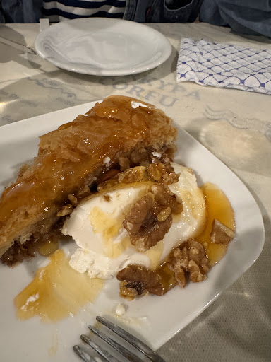 Atmosphere: Truly perfected our stay at Corfu. The restaurant is covered in so many beautiful flowers. The owners are always nice and kind, each member of the staff as well. We visited the restaurant and the little shop also owned by them a few times and it had always been a very pleasant experience. We even received free dessert and drinks. Don't even get me started on that... Drinks: I will miss the bartender dearly because never in my life have I had drinks this good. He adjusts the drinks' recipes a little bit but he certainly knows what he's doing. Food: Everything was increadible. The meat, the fish, the desserts... I don't know the name of the dessert I received, but I was told that few of the desserts including this one is made by the owners wife. Everything was very tasty.