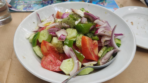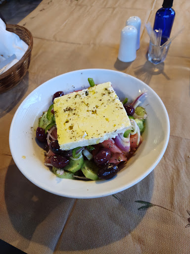 Portions were large. Started off with fresh bread (so much!). I had a huge 'range free' steak for 9.5 euros, delicious. Big greek salad, fresh veggies, with a lot of feta. French fries were fresh too.