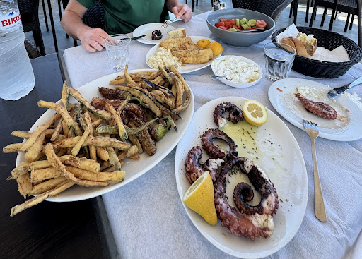 The food here is disappointing to say the least. We ordered the cod as were told it was fresh however it was extremely fishy and definitely wasn’t fresh. We ordered the octopus and it was barely warm and very chewy. The tzatziki has the texture of shop bought and the fried vegetables were so so greasy that we couldn’t eat much of them and felt sick after. We have been in Greece for 7 days and this is the worst’s meal by far that we have had and a very disappointing way to end the holiday. If you want large portions of low quality food this is the place to come. Dont believe the many good reviews, just find somewhere better!