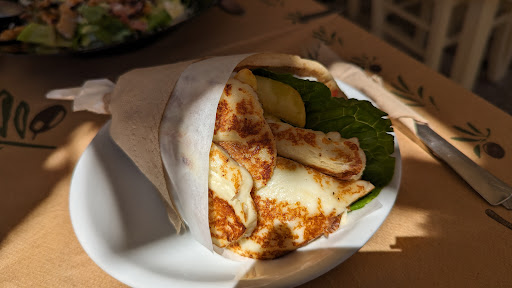 Not too many restaurants open in Symi early April so tried here.. Outside but covered and quite sheltered. Limited choices available out of season. Opted for zucchini fritters and tsatziki to start, generous portions and tasty although the fritters were not homemade. Made the mistake of ordering a main course each. Masses of food and both included tsatziki and pitta, meaning quite a lot not eaten. The plated gyro with salad was good and I could see its popularity for gyros. The sausages were also very nice. Fine for very large appetites or for a simple gyros. With a litre of house red the bill came...