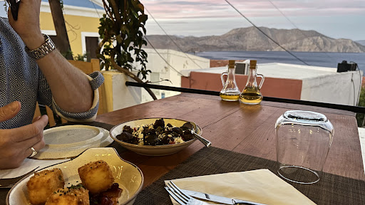 Read moreIf you overcome the fact of going up at least 500 steps and you reach the place sweating then you ll be seated in a courtyard full of fans hanging from the ceiling. If you go in the evening, there is nothing much to admire. We were received in a rather lukewarm manner and the service although simple was utterly unprofessional, left to teenagers and thus non-experienced staff. As for the food itself, I am afraid it was just like the service: without character and ultimately disappointing; it lacked the right intensity and elevation of flavours. The only standout was the Symi shrimp, nicely fried and sweet. But for the rest, the squid was under-seasoned, the zucchini balls were ok but the“avgolemono” sauce, watered down and nothing to do with the real deal. And then the main, the seafood pasta, flat with “fruit de mer” counted, in a “bisque jus” with no intensity and a lemon juice undertone, overpowering the whole dish. Btw, this is one of the few seafood restaurants, were no wet towels are offered for you to clean your hands after eating seashells. So, for a place that wants to be called a “restaurant” and not a “tavern”, this dinner was expensive and that’s is why I wouldn’t even bother...