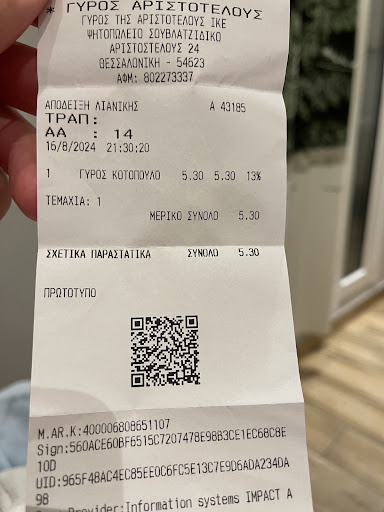 Read moreΕξυπηρέτηση και ευγένεια ούτε καταδιάνοια επίσης το ποιο ακριβό τυλιχτό που έφαγα στη ζωή μου ever 4,50€ πίτα με γύρω χοιρινό πατάτες ketchup μουστάρδα. Στην αυστραλία απέναντι από το σπίτι μου η πίτα με τον γύρο κάνει 6 δολάρια δηλαδή 4€ και ο μισθός μας είναι τετραπλάσιους από την ελλάδα. Ντομάτα μια φέτα Ούτε τατζίκι ούτε κρεμμύδι αυτά έχουνε διαγραφή από το μενού τους. Είμαι φαν του τυλιχτού και επιμένω ότι μου έκανε πολύ αρνητική εντύπωση πολύ υψηλή τιμή στους συγκεκριμένο κατάστημα στην χώρα που γέννησε το συγκεκριμένο φαγητό. Έλεος.....