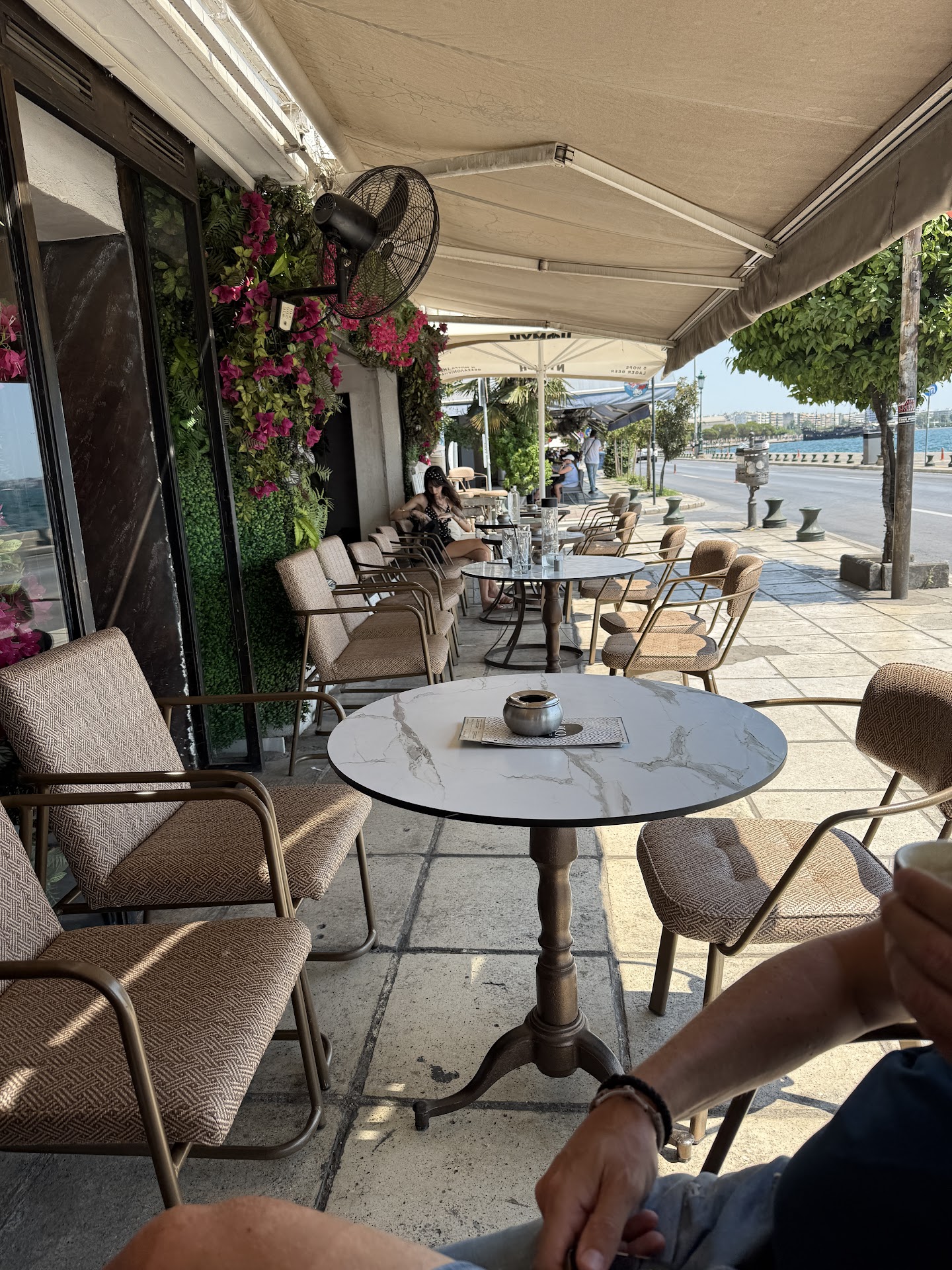 It's a nice small cafe/bar located at the city centre in front of the promenade with view all the mountains and sea! I actually heard that it opened recently and thought to give it a try and it was definitely a total win! The service was on point, as soon as we sat the garcon came and brought us a can full of water and was immediately to take our orders and answer to any question we had about the menu! I'm a huge cappuccino lover and knower and I have to say that it was one of the best I've drunk in Thessaloniki! All in all an excellent and also quite low on the price choice to drink a coffee and enjoy the view! Alright guys that was it c ya...