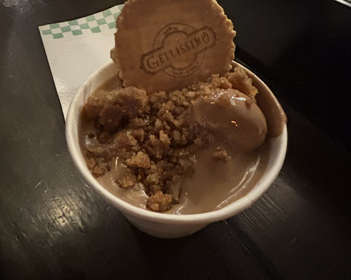 The dish is a decadent creation featuring a viscous, thick, and extremely sugary liquid that tastes distinctly like melomakarono, a beloved Greek holiday treat. It’s paired with melomakarono-flavored ice cream and topped with crumbled melomakarono for a cohesive and indulgent flavor profile.