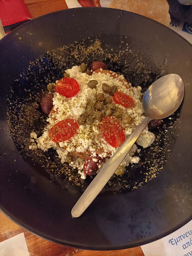 Γνωρίζοντας ότι μπορεί να μην βρίσκαμε τραπέζι, τηλεφωνήσαμε 2 ώρες πριν για κράτηση, η οποία δεν έγινε δεκτή λόγω αυξημένων κρατήσεων. Παρόλα αυτά όταν πήγαμε στο μαγαζί, βρέθηκε άμεσα τραπέζι, παρόλο που το μαγαζί ήταν γεμάτο. (Υπάρχουν τραπέζια και στο εξωτερικό του καταστήματος -για καπνιστές- και εντός.) Δοκιμάσαμε τη σαλάτα του μαγαζιού, τα στικς κοτόπουλο (παναρισμένο στήθος κοτόπουλου σε στικς -γευστικότατο, πολύ μικρά κομμάτια- ), μανιτάρια γεμιστά (νόστιμος μεζές), 2 διαφορετικές τηγανιές (αρκετά μικρά κομμάτια κρέατος, με πιπεριές κλπ), πατάτες τηγανητές, φέτα τυρί με κρούστα και ουζόμελο και ήπιαμε κρασάκι, 2νερά κι 1αναψυκτικό. (Κόστος 50€... εξαιρετικό το ψωμάκι και το γλυκό στο τελείωμα) Η διακόσμηση του χώρου είναι απλή και η μουσική (έντεχνη) "συνοδεύει" τις συνομιλίες του κόσμου. Υπήρχε σχετική "συμφόρηση"...