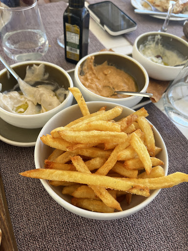 THE BILL CAME!!! €96 we knew the prices of course from the menu and were ok with them but nothing added up. Here's a list 3 meals and 3 drinks. €09 Apetizer Bread (€3 per person/€3 per piece) (The bread which we never ordered) €18 Chicken Gyro(PRICE OK) €07 Fried Potatoes (was supposed to be option either bread or potatoes with the gyro but SCAMMED as extra) €05 MAYONNAISE!!! (SCAM, which restaurant charges for that or that much if anything) €14 PLAIN SPAGHETTI (OIL) (PRICE ALRIGHT) €18 Chicken Fillet(BIGGEST SCAM supposedly the chicken which we ordered in the chicken Spaghetti for our 3y/o Son.) That is why he insisted to put it on the side, he SCAMMED us for a whole chicken fillet meal with nothing else with it (a chicken fillet meal doesn't come plain with nothing else)SCAM! €23 Seafood Spaghetti (PRICE OK) canned shrimp...not ok. Drinks were also alright at €4/Coke/Pepsi and €5 Iced Tea.