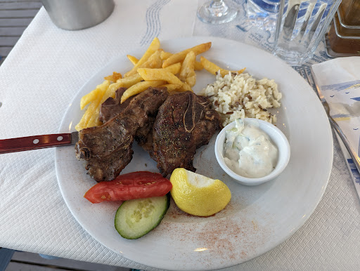 Read moreIt's another one of a long line of large Greek tavernas along beach road with open fronts and an excess of Greek regalia that makes you question their authenticity. It was busy on our visit but it turns over it's many tables quickly so there was no wait. During the daytime the restaurant looks out across beach road to the beach, at night the road is pedestrianised and the beach disappears after the sunset. The open front and sides let the Santorini winds provide what can be quite blustery ventilation but it definitely gives it that seaside feel. The choice on the menu is massive, in common with most of the tavernas along the beach, illustrated with pictures of some of the dishes. I had Santorini specialty tomato fritters for starter and sea bream for mains; both were fresh, well cooked and tasty. Digestifs of limoncello and ouzo were offered on the house to round the meal off. The bill was quite reasonable, about €55 including plenty of house...