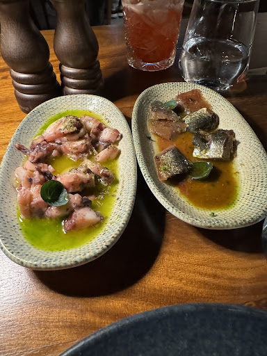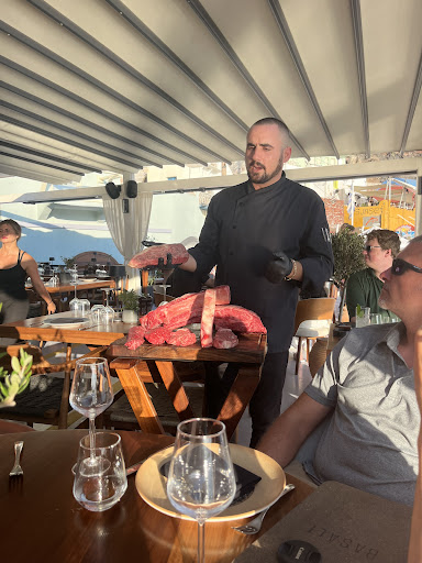 Read moreA bit on the pricier side but an absolute must try if you can go! The staff is all super friendly and you can tell they like to work there because it shows with how thorough and passionate they are. To start off they bring out a sample show of both the freshly caught fish from that morning and the assortment of steaks they have. It’s a full experience they give you. To start off my parents got a sangria which they said was really nice, and I got the “Basalt” drink. It was really well made and clean tasting and it tasted kind of like a green pina colada. After that for appetizers we got the white fish ceviche and the Aegean Shrimp Tacos. Both were absolutely amazing, super fresh and filled with lots of different spices. Both appetizers were around 20€. For the mains we ended up choosing the Mosxida steak and the Red Snapper. It is more of a shared dinner where you order a steak or fish and share it with the table because it is expensive but comes in big portions. The steak came with chimichurri, some sort of butter cream sauce and veggies. The butter sauce tasted like absolute heaven and the chimichurri was amazing as well. The steak was cooked perfectly and the flaky salt it came with elevated it. For the fish it came with a buttery olive oil sauce and was cooked very well. They debone and fillet it right in front of you so it’s a cool little experience. The skin of the fish had amazing seasonings on it and paired perfectly with the delicate fillets. For dessert we got the “Salami” which looks like a log of salami but in reality it is a chocolate fudge with nuts and cookies topped on it. It was my favourite dessert so far I’ve had in all of Greece. At the end they gave us shots of limoncello as a nice finish to the meal. Overall one of the best experiences I’ve ever had and definitely my favourite restaurant I’ve been...