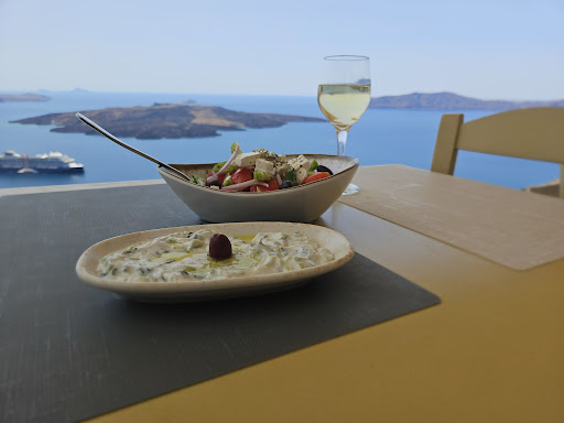 The location was unbelievable with a views of Fira and the cruise liners in the bay down below, it is also a great place to watch the sun set. The waiter was very friendly and nice to the kids.. We stayed a total of 10 days in Santorini and this was by far the worst food we had during our stay... We ordered the steak and the chicken breast. 40 mins later our meals arrived and they were awful. The steak was tiny and like rubber and the sauce was like it came from an instant packet. The chicken was dry with a tough exterior and tasted like it was cooked in the microwave. The potatoe slices were from a frozen pack and were tasteless. We ordered apple juice for the kids and it had a texture similar to the inside of an apple crumble, the kids couldn't even drink it through the straw. All in all it reminded us of a meal prepared in a student house. We paid over €100 for the meal and we ended up leaving hungry. I would NOT recommend having food at this restaurant, it is over priced and the food is awful. I would definitely recommend a drink to watch...