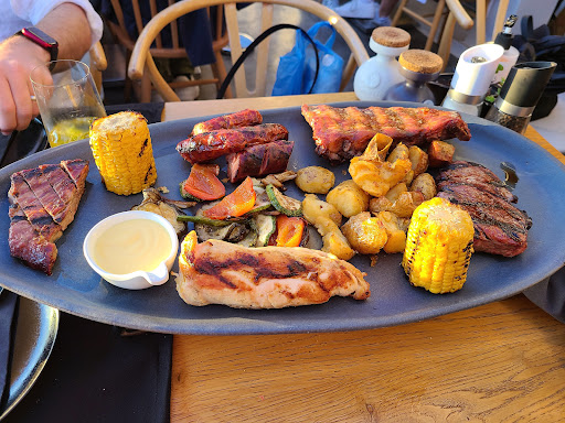The place is nice but seating is a little tight. Service was mediocre at best as it was hard to get attention. Our entree, more than anything else, was so disappointing (despite being incredibly expensive). We had each planned to order different meat dishes so my husband suggested we do the meat sampler instead. Most of the meat we were given was overcooked and barely seasoned (the sausages had seasoning in them and the ribs had a sauce but that was it). It came with a bearnaise sauce on the side but that wasn't cutting it and the sides of potatoes and corn also weren't cooked or seasoned well. Super disappointing. I was also sitting against an ivy type wall which was really awkward as I couldn't lean back.