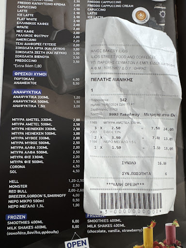 When I went back to buy some drinks I noticed no prices. I asked how much it was for a 1.5L water and the guy said not sure but probably 1euro. So I got the water, 2 x Aloe Vera drinks and 3 x 330ml beers. At the checkout one lady calls out to another lady to add it up. I paid 16.30 euro in total which I didn’t think too much about at the time but when I checked the receipt I couldn’t make sense of it as the descriptions didn’t seem to look right also it was in Greek. I immediately went back to question if I was charged correctly. They said it was correct even though I said a beer at the stores all around here are only 1.50 and you charged me 2.50. The water was charged at 1.50 when your staff told me 1.00. The aloe Vera drinks were charged at 3.90 each. The ladies were getting defensive and said if you had ordered online it would be cheaper. I’m thinking okay this is really not making any sense now. Rather than get into an argument I decided to leave it at that. They may have made some extra euros from me but they have lost the rest of my business for my stay at Santorini. Congratulations to Ilios Bakery for ripping of trusting Santorini visitors. Great hospitality. I would have tried some of your food but I will never...
