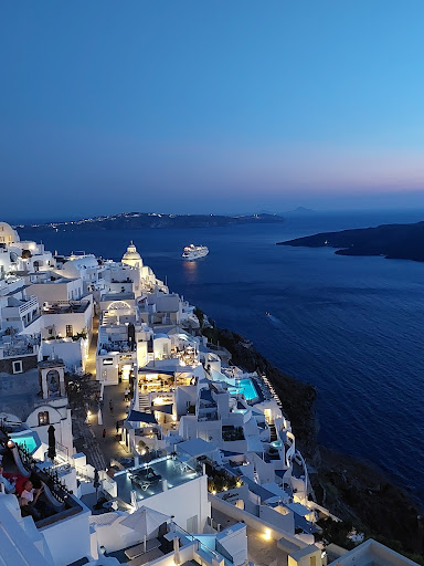 As the sun dipped into the Aegean, the lights of the cliffside town twinkled to life, creating the most breathtaking view I've ever seen. It felt like time stood still. 💙