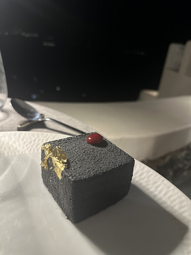 The views are nice and the heat lamps were nice to have. The dessert course was actually tasty, it was an ice cream cake that looked like a block of charcoal and they added a flake of gold and a tiny drop of raspberry on top for fun.