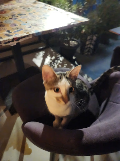 We stopped in here to get a different bar vibe from all the other places on Santorini and certainly got that. The music was a mix of old school metal and alternative from the 80s and 90s. The posters hinted at harder music, but we didn't hear any while there. We got there earlier in the evening, and there was a strong vibe shift at around 10:00pm, when a DJ showed up and the music got significantly louder and not at all rock focused. We moved outside to avoid the growing crowd and hung out with the 5 star cat that owns this place. Drinks were good, fries were tasty, cat was perfection. My only wish was for the music to have gone harder into the rock genre with more heavy...