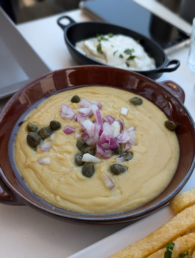 July 2024 Trip: lunch at The Old Barber Shop in the village of Emporiou in Thira. This is such a pretty village! Full of little winding paths on a hill, and full of white houses. Easy to get to if you have a car. The restaurant is all outdoors seating, and has nice views. The service was very friendly, and the food was excellent đđ. . Sausages Soutzoukakia saganaki with tomato sauce and feta cheese: this was sooooo tasty!! I used bread to dip into the sauce to eat it all up đđ. Santorini fava: nicely done - super smooth đ The old barber's salad Complementary dessert: a bit on the sweet...