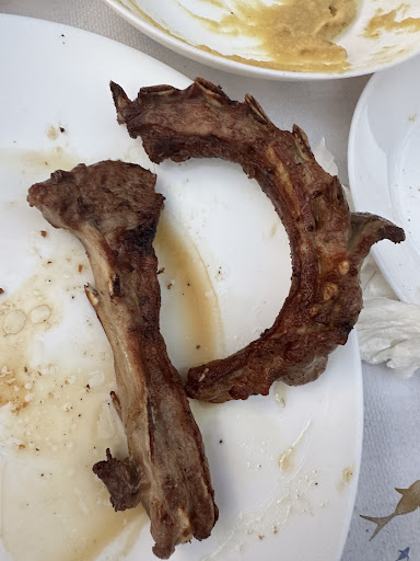Was served 4 chops and about 15 chips for 18 Euros. 2 chops I ate as they were fine, the other 2 pictured had zero meat on them. I asked if this is typical given they said 7 or 8. After some attempts at gaslighting us that this is what lamb chops look like they said they would make “3 or 4 more.”