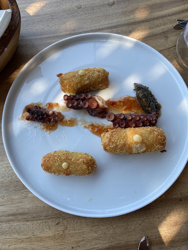 Upon looking over the menu we noticed all of the starters were in the 40 euro range, while the fishes and meats started there and got far pricier. This would be acceptable, IF the food was anything special. But NONE OF IT WAS. Our 40+ euro octopus was not even a full tentacle. It was 3 bite sized pieces with little flavor and a tough texture. My 40+ euro lamb had a piece of bone that had not been removed--not by design (this was a lamb filet that was pre sliced, not a rack of lamb or a shank). The flavor was bland, it could have been frozen for all I know. My wife's 38 euro chicken breast was similarly unspectacular. Neither of these dishes came with anything special as a side, only garnishes. We felt as if we were eating In a caricature of a high end restaurant where you pay insane amounts of money for a splash of drizzle across a single bite of food all in the name of trendiness.