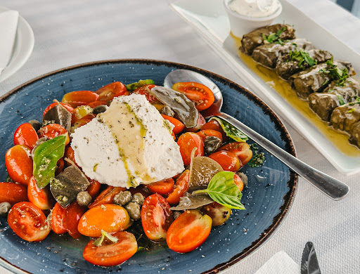 Situated in a prime location, the restaurant boasts breathtaking marina and sunset views. The ambiance is elevated further by their impeccable service, making every moment memorable. A unique highlight is the opportunity to gaze upon the day's fresh catch and handpick your dinner choice. As we perused the enticing menu, recommendations and choices became a delightful dilemma. We started with a sublime pairing of creamy silk burrata and the sweet, luscious Santorini cherry tomatoes. The vine leaves, wrapped meticulously, were a zesty and warm treat. Our main course, the freshly caught red snapper, became a spectacle as it was expertly cleaned and presented right at our table. Its simple grilled flavor, enhanced by its freshness, required minimal adornment. Yet, the lemon butter sauce accompanying it was the cherry on top, striking all the right chords.