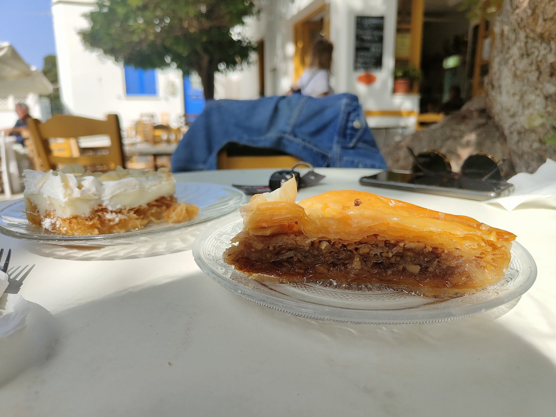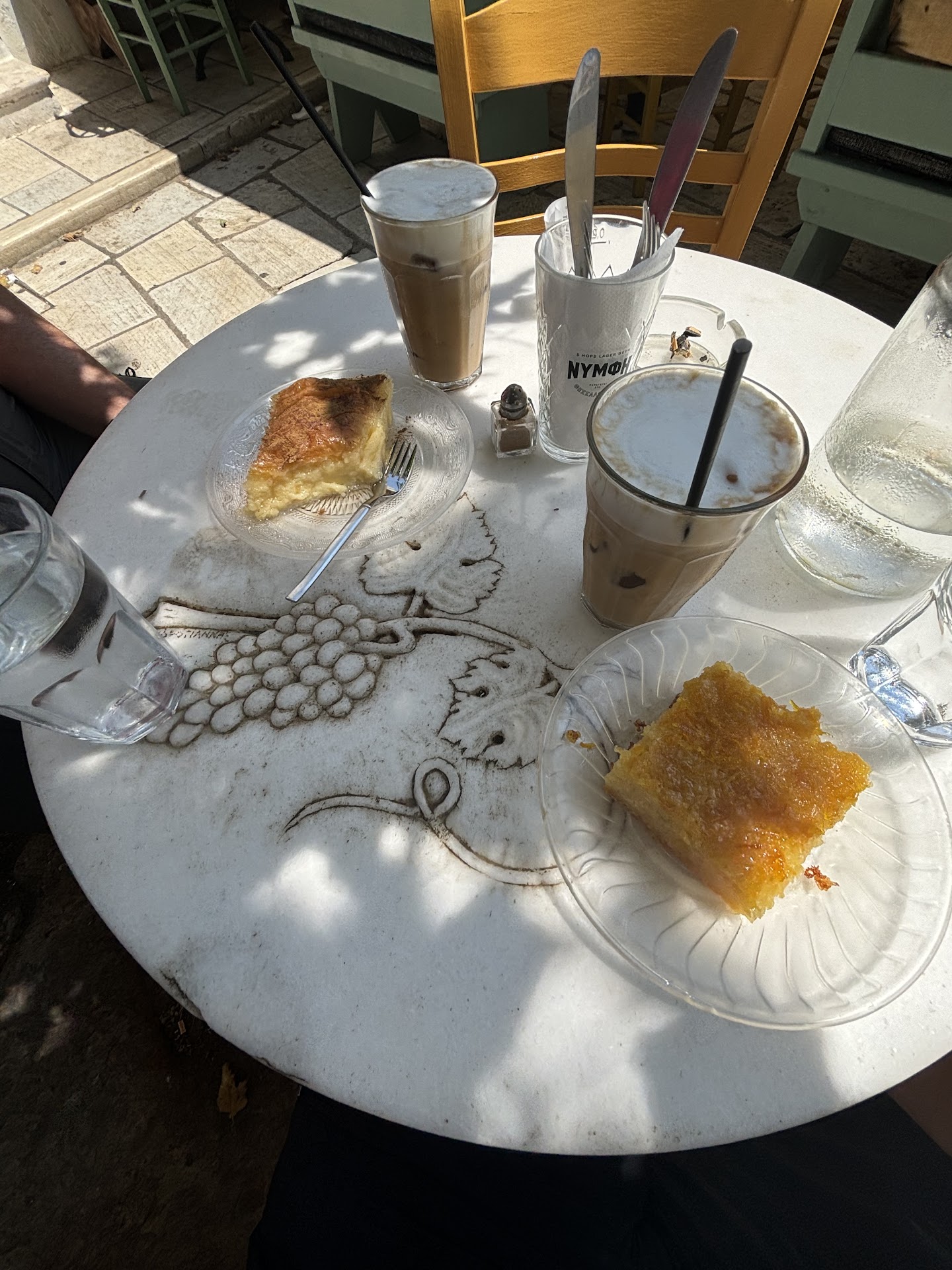 Nice iced latte coffee and traditional sweets at the village's square, under the plane tree.