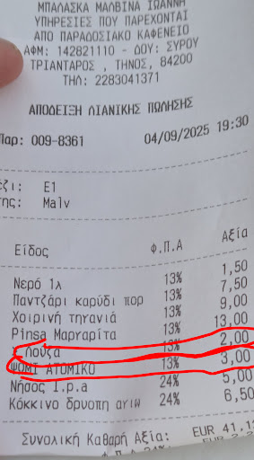 Read moreΤο φαγητό είναι καλό, πολύ ακριβό βέβαια για τόσο μικρές ποσότητες. Η πίτσα για παράδειγμα που προοριζόταν για κανονικό μέγεθος 8 κομματιών τελικά ήταν ατομική, αλλά με τιμή κανονικης. Παρ' όλα αυτά η ποιότητα είναι καλή και θα έβαζα 4 αστέρια αν δε συνέβαινε και το εξής γεγονος: Παίρναμε κάθε μέρα με take away 2 με 4 καφέδες όπου πληρώναμε 2 με 2.5 ευρώ τον καφέ. Την τελευταία μέρα αποφασίσαμε να κάτσουμε για πρωινό και να πάρουμε μετά τους καφέδες στο χέρι γιατί έπρεπε να φύγουμε και να αφήσουμε το σπίτι άμεσα. Να τονίσω πως οι καφέδες ήταν για take away κάτι που τονίσαμε και στο σερβιτόρο. Οι καφέδες ήρθαν μεν, σε χάρτινο ποτηράκι για take away όπως ζητήσαμε αλλά χρεώθηκαν σε τιμή σερβιρίσματος δηλαδή 3.5 με 4 ευρώ. Μιλάμε για σχεδόν τη διπλάσια τιμή. Όταν πήγα να μιλήσω στην υπεύθυνη μου έκανε αρκετά ξεκάθαρο ότι η πολιτική του μαγαζιού είναι αυτη κι ότι δε γίνεται να κάθομαι στο τραπέζι της και να περιμένω τιμή για take away. Αυτό που δεν καταλάβαινε είναι ότι δε με πείραξε η τιμή αλλά πόσο ξεδιάντροπα αλλάζουν τις τιμές έτσι κι απαιτούν μετά να έχουν και κόσμο. 1000 φορές να έπαιρνε τη διαφορά ως πουρμπουάρ ο σερβιτόρος που ήταν αρκετά ευγενικός. Μιλάμε για περίπου 5 ευρώ tip για 3 καφέδες... Edit: Να τονίσω πως οι καφέδες ήρθαν μετά το πρωινό όταν φεύγαμε αφού αυτό ακριβώς είπαμε και στον σερβιτόρο όταν τους παραγγείλαμε. Επίσης σχετικά με την απάντηση που βλέπω παρακάτω να πω στον αγαπητό ιδιοκτήτη ότι δε δουλεύουν όλα τα μαγαζιά έτσι. Αν κάτσεις και πάρεις καφέ σημαίνει ότι θα σερβιριστεί ο καφές σε σερβίτσιο με γυάλινο ποτήρι και συνήθως συνοδεύεται με νερό. Αυτό είναι που πληρώνεις όταν κάθεσαι. Εδώ μιλάμε ότι πληρώσαμε τον καφέ σε χάρτινο (γιατί θα φεύγαμε αμέσως μόλις τρώγαμε όπως κι εγινε) στην τιμη του service. Για να καταλάβετε τη διαφορά ο freddo cappuccino σε take away κόστιζε 2.5 ευρώ. Εμείς όμως τον πληρώσαμε 4 ευρώ! Κάντε τα μαθηματικά εσείς...