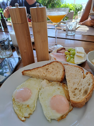 Grandfather's breakfast: This breakfast platter consists of 2 sunny side up fried eggs along with a delicious selection of local tinian cheese, "Louza" slices of delicious meat and sweet grapes. Once assembled on fluffy bread slices, you would taste Tinos in a bite! Super delicious, sweet and savory, creamy and crunchy! It's not done yet! You also get a bowl of Greek yogurt topped with local honey sirup that mix so well so that you get a healthy, light sweet note at the end of your meal!