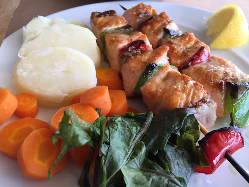 We ordered a classic Greek salad, fried calamari, and grilled skewered salmon. Amazingly fresh produce was used in salad, perfect blend of the elements. :-) the calamari was the best I’ve ever had, and that’s saying something as lived on multiple coasts and currently live in Marseille, France. The salmon was one of the best I’ve ever had. My wife said it was her favorite of all time.