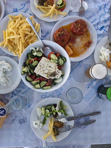 This is a great tavern right next to the sea. It has an unpretentious and simple menu. It is greatly favoured by locals during the summer. The fish is always fresh and cooked to perfection. Most of the ingredients are locally sourced and cooked in a simple traditional way. it is important to understand that this is a tavern and not a posh restaurant so what you should expect is to be seated in a table just by the sea under the shade of old tamarisk trees, have some ouzo or raki while you wait for the Greek salad, boiled greens, Cretan yogurt, calamari and fried or char...