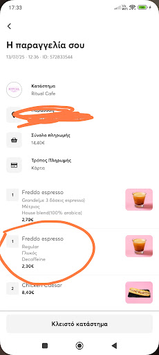 Παραγγέλνω από e- food και συνήθως είναι όλα τέλεια. Είναι όλα τέλεια γιατί ζητάω ντεκαφεινε και βάζω στα σχόλια να είναι ΟΠΩΣΔΉΠΟΤΕ ντεκαφ γιατί θηλάζω. Σήμερα, όπως την πρώτη φορά που παρήγγειλα, δεν το έβαλα στις σημειώσεις με αποτέλεσμα να μην δώσει κανένας σημασία. οταν κάποιος ζητάει ντεκαφεινε θα πρέπει να δίνετε έτσι κι αλλιώς πολύ μεγάλη σημασία χωρίς να εξηγεί γιατί ! Άλλοι άνθρωποι έχουν καρδιά , στομάχι χίλια δυο. Δεν είναι αναγκασμένος κανένας να εξηγεί γιατί θέλει ντεκαφεινε απλά οφείλει ο μπαριστα να βγάλει σωστή παραγγελία.
