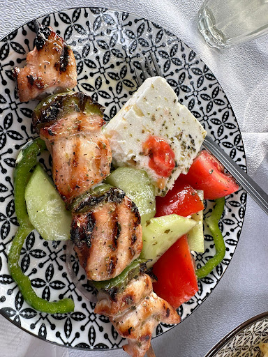 Drove past a sign for the village taverna in the village we are staying and couldnt find it anywhere on the maps. Decided to go for a walk and asked them whether they were serving food. They seemed overjoyed to see us and and wiped down all of the table from the tree dropping some leaves above, and brought us out some wine. We asked what was on the menu and the owner read the menu out to us - it was in his head not on paper. The menu was a range of traditional greek taverna grill food (e.g. chicken souvlaki, pork souvlaki, chicken breast grilled, lamb chops and steak but he also listed courgette fries and aubergine skewers as well as his own greek salad. Opted for chicken souvlaki, greek salad and fries and this all arrived fairly with a smile and friendly Greek chatter about the church and the local priest. Couldn't fault the meal and the whole thing came to 19 euros which was so silly for the amount we ate that we paid them 30 under much protest from the owners.
