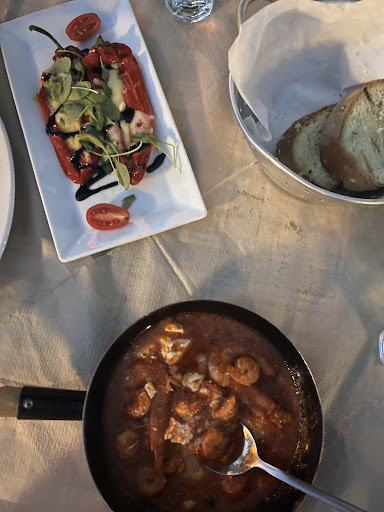 Otherwise the food was amazing - we ordered garlic bread, shrimp saganaki, peppers stuffed with cheese and herbs, veal stew and lamb with vegetables. I cannot say anything bad about any of it - i truly enjoyed every bit of it and left with a full tummy. The location of the taverna is very cozy, trees and flowers do the job and I did not feel like I missed the sea view.