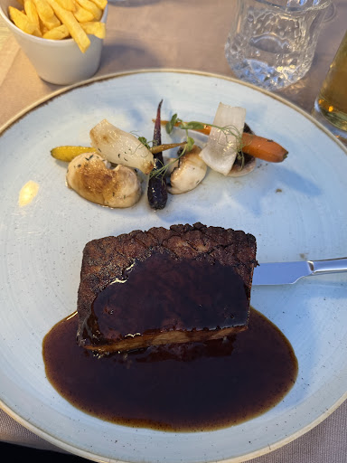 We had a really lovely dinner here last week. The restaurant is beautiful, really nicely done out, lovely lighting and ambience. The staff are very friendly and helpful. There are nice little touches like the little tray of aperitifs that they bring whilst you choose from the menu. We had the prawns for starters which were delicious and also the salmon with the sorbet - we were split on this dish with one of us quite liking it and the other thinking it was a bit weird and didn't really work and also the salmon seemed as though it had been slightly over cured. We did mention this to the waitress and we were very kindly given a carafe of wine on the house which we assumed was an apology for this and we appreciated. For our mains we had the braised lamb and the pork belly both of which were absolutely delicious and we really couldn't fault. We then shared a dessert of a chocolate fondant which was also very well cooked and served. We have given five stars despite the issue of the starter and also we did feel that the clearing of tables and a couple of little details were a little on the slow side but still felt that for the overall price that we paid the whole experience was good value and would recommend spending an evening here for dinner. We...