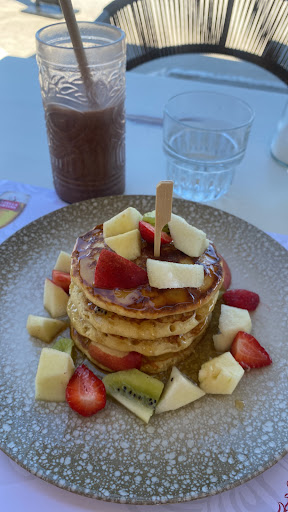 Read morePerfect for a good shade in a hot summer morning. We ordered the fruit pancake and savoury chicken crepe, both were impeccable and delicious! Pancake was richly layered with fruit, generously drizzled over with maple syrup. The chicken crepe was served hot, and cheese in the crepe was melted perfectly. A splendid breakfast overlooking the port of Naoussa! Extra tip: cold chocolate is perfect for the weather, if your here...