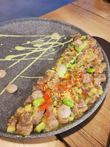 US RIB Eye à 60 euros. C'est clairement une honte. On vous sert 200g de viande, dressée de façon traditionnelle en tranches. La moitié de celle-ci était à point et 3 seulement à la cuisson demandé. La viande est correcte mais pas tendre et ne vaut pas son prix. La sauce miso est extrêmement salée et elle est vraiment posée dans l'assiette comme à la cantine. Votre viande est en contact avec celle ci. Et votre accompagnement sera un pain pita minuscule de 8cm de diamètre sur 2 mm d'épaisseur. C'est extrêmement sec et ça baigne dans cette sauce infâme. J'ai demandé une explication pour la sauce. Il reconnaisse que c'est salé mais ils mettent ça sur le compte du Miso. J'en ai déjà mangé. C'est salé mais pas au point de donner la nausée.