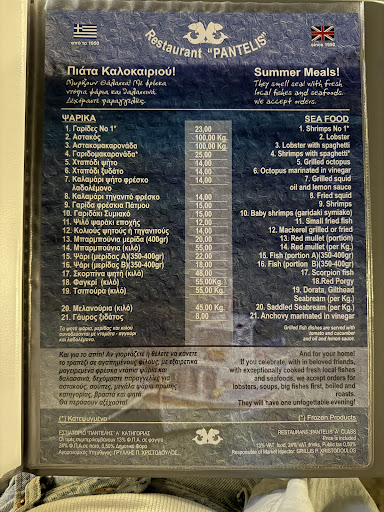 We went this restaurant only for fish and salad and ordered a few small plates. Gosh was delicious and very fresh, we really enjoyed it. We did not like the salad though. It could have been better. It was fresh but it was just not a right salad. Fish deserves to have rocket salad which was not available. They prepared a salad with lettuce, called Pantelis salad and it was said the best but it was not. Thank you for the fish! Simi karides, small shrimps...