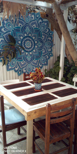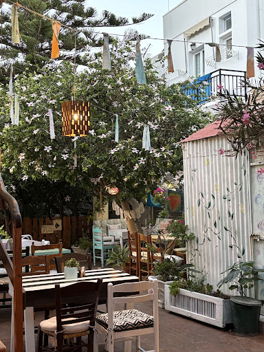 1* Wonderful lovely cozy and personal furnished and decorated restaurant in the middle of Scala. Everywhere around the inner yard, where you sit between flowers and upcycled furniture, there are little details of decotation and sweet spots for your eye. 2* The food tries to tickle every taste sense you have, because it is to awesome and delicious to be just food - it is divine. Lets be honest: i am not vegan at all...but i tasted the mushroom burger and i immediatelly was impressed by the taste und feeling. The best vegan food i ate till now! P.S. try the sweets!!! 3* the service is very personal und nice. After a few sentences, I felt like I am invited at a friends house and not at a restaurant. They tell you everything about the concept to the vegan menu till Patmos sightseeing. You come as a stranger and you will leave as a friend. 4* Everything is clean and tidy. The plates and glasses, although very nice upcycled, are clean and good-looking. The chefs wear prober and clean cooking outfits. Be aware of mosquitos, because of the garden around. But you can ask for help :) 5* Because I support the attempt to establish a vegan restaurant in Patmos, so this island has a unique place more to...