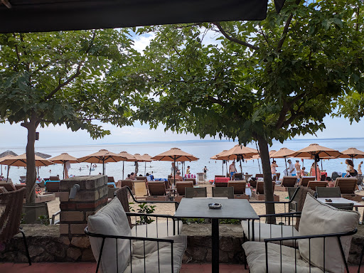 This is a lovely spot on the beach side of the main road. Loungers under umbrellas and tables and chairs under the shade of trees. Easy bar menu. Food was lovely and fresh, coffee good and homemade lemonade. Service was excellent. Use of loungers and chairs was free for those ordering food or drinks. We came two days in a row. The beach is sandy and the water clean. We were there during the week and parking wasn't a problem. Music was being played from large speakers but it never seemed intrusive.