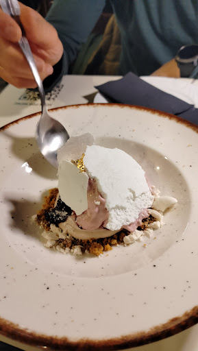 Then a tiny salad of raw courgettes, which wasn't even seasoned properly. Then the tiny quail, which looked like someone had killed it with a sledge hammer on the plate! Blood splattered (it was a tasteless berry sauce) and a strange pink mousse. It should have been served on a bed of pureed sweet potato, or fava ...something!!! The saving grace was the ice cream and broken pieces of meringue in it. That was nice, and also my bowl of roasted potatoes and feta.