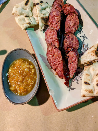 Read moreReally incredible place we found for lunch after visiting the caves. The owner was patient with his recommendations and absolutely did not miss. We got the special salad of the day - made like the other "wild greens" that seems typical of restaurants in the area. I have no idea what the green was, he said there wasn't a good translation but it grows by the sea in Kefalonia, but I will be thinking about it for a long time. It was kind of frondy and very tender, and there was a perfect refreshing amount of olive oil and lemon. We also had some cheese (the local one with ginger) that was decent, and some smoked eggplant spread. The spicy sheep sausage was incredible, as was the fried pork with pepper. They also had some white Robola wine to drink with it all. At first I was disappointed that they were out of the fresh fish catch of the day but ultimately I'm so glad we ordered what we did - one of our best meals...