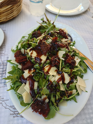 I'll go through what we served: For starters, I tried the melitzanosalata (which is "salata de vinete" for us Romanians). It was good, but I prefer it with onion instead of garlic... this is how we prepare it in Romania and the taste is very different because of that. This is a subjective preference, of course; I also tried the Saganaki, which is fried local goat cheese. It was good but very salty and dry, and it was just a thin slice. I know it's a starter, but I found it to be a very small portion for 7€, in my opinion. My girlfriend tried the Rocket salad, which was good. The lettuce & rocket were fresh, the dried tomatoes were tasty, it's only the dressing that we believe it missed something for more taste. But it was good. For the mains, I tried the Mousaka, which is served in a ceramic pot. I'm a very big fan of this dish but unfortunately, the minced meat contained a condiment which I didn't enjoy. The bechamel sauce was very good, but I could barely taste the meat because the condiment overpowered its taste almost entirely. On top of that, the dish was very fatty and the melted fat laid on the ceramic pot floor. My girlfriend had the grilled sea bass, which came with the fries. The fish was fresh and tasty, but it was too dry... meaning that it was left too much on the grill.