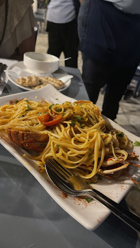 The waiters were clearly having a busy day and kept sweeping across our seats. When we gave our order, they did not appear to be very knowledgeable of the menu. As we had already pre-ordered the lobster however, I went in and chose one that was as fresh as they come (1.2kg). We also ordered a couple of other things. Some breads were swiftly served once the order was made but those were clearly stale. Our salad and octopus kefte arrived very quickly too as if they were trying to close all orders in some sort of record time. What became apparent during the first 5 mins (order, breads, starters and wine all delivered) was how loud the owner (Tassia) was that was located just behind us, giving orders continuously in a rather militant fashion to her workmen. Making matters worse her language was not the most refined, making the whole experience worse. Food wise, our salad was very average and the octopus balls (kefte) appeared rather burnt , black, and oval shaped.... and tasted not great either. The mouse of octopus did not have much octopus in and it all felt as heavy as a bullet. We were optimistic that the main part, our lobster pasta dish would be smashing......