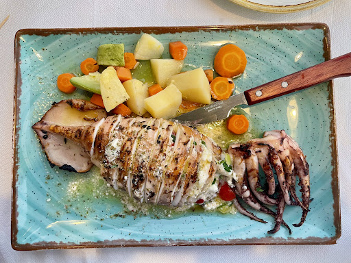 I had • a Mythos beer - as it should be • a bottle of Retsina - a brand I haven’t tasted before, and I was pleasantly surprised • a plate of olives - green and red/brown/black, tasted as they should • stuffed calamari - I could taste all the ingredients and that was fine. Not gobsmacked by the quality but overall good. Now I might be a seafood newbie, but isn’t seafood - even generally - supposed to be served warmer than lukewarm? Ok the outside and evening temperature was 28 degrees Celsius but still… I dove into the dish straight away but it seemed like it had been waiting on a shelf somewhere inside the restaurant for too long, perhaps forgotten.