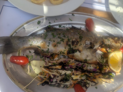 Like a Tale of Two cities we arrived to a tale of the best and the worst of lunches. The Sea Bass was the standout winner with the flesh being succulent, fresh and incredibly moreish, however the slaw with balsamic reduction served with it made absolutely no sense whatsoever. The fried calamari was a complete let down, 12 pieces of slightly tough tasteless invertebrate served with the same slaw and balsamic reduction did not want a €14.5 price tag warrant. Being served a Mythos draft in a glass so cold it made snowflakes in the beer was like a having a fairy godmother make my wish come true after 45 mins on an ATV on dirt track. Tzatziki was well seasoned with the mint and lemon coming through nocely, but the crouton salad was huge and buried us, something best shared between 4 people. Be careful with the water that is opened as soon as you sit down, it's not complimentary and you might want to decline the fake...