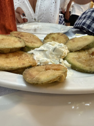 Friendly and accommodating personnel. The atmosphere is as stereotypical as it can get in a narrow Greek small town cobblestone street. Thus it feeds right into the unimaginative mind of the typical tourist. Good or bad? Neither, just a fact. I’m sure plenty get the experience they wanted. The food was neither mind blowing nor disappointing. Plain standard. I had: • fried zucchini with tzatziki - which I for some reason expected to be more crisp, but the taste was ok. • calamares - ok portion, but lacking in savoury taste. • shrimp saganaki - nice big prawns, and it might be standard to cover everything with cheese, but when there’s so much cheese as this restaurant puts on, and a very very plain and boring kind, it makes you wonder whether the cook just made a mistake or if, sadly, they’re trying to mask a suboptimal quality of the rest of the ingredients.