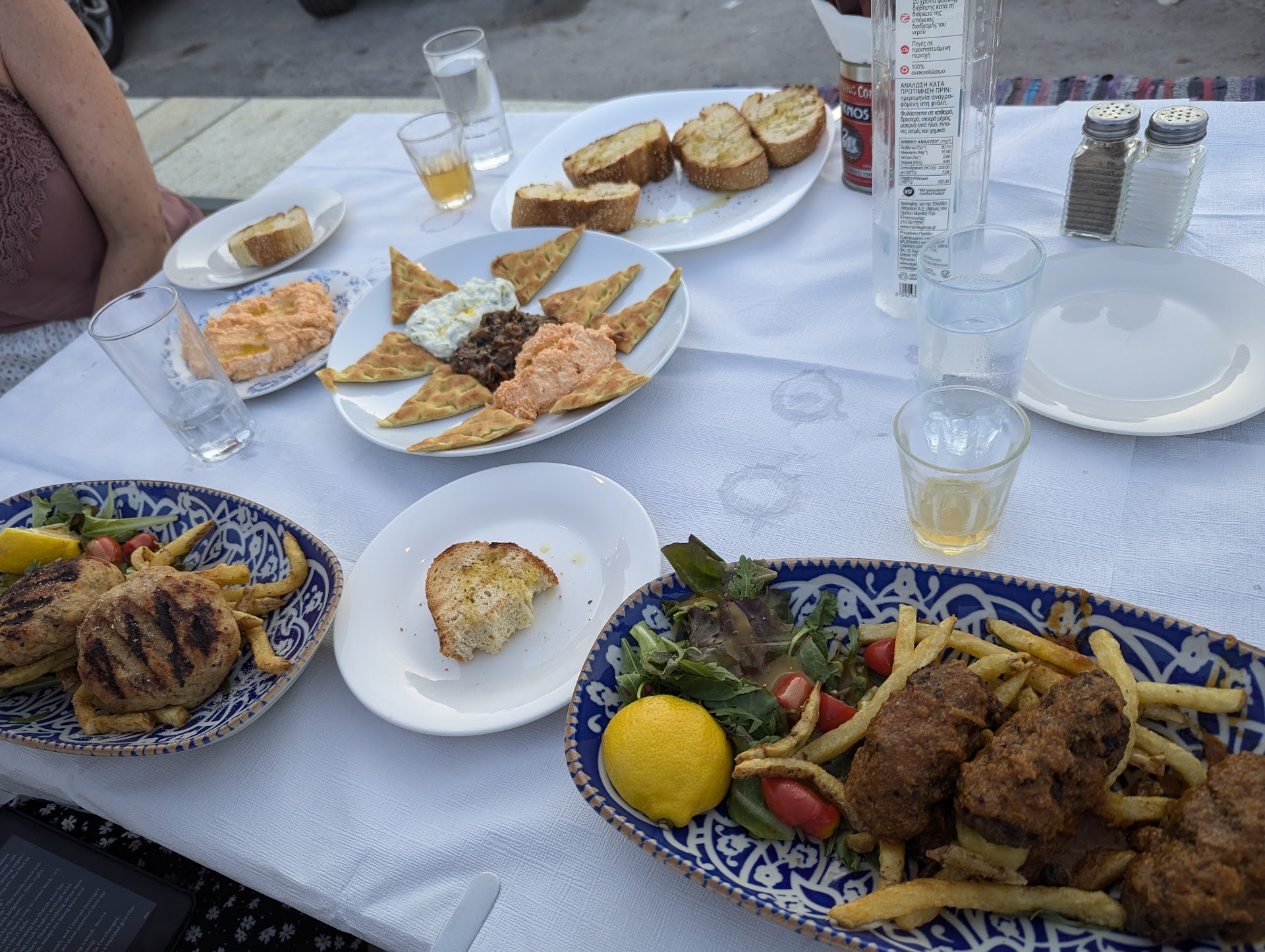 We walked up from the port which is quite a steep walk in the heat. Beautiful setting & greek musicians were the best things about this restaurant. Food was very bland, cats jumping on table throughout the meal and the service was shocking. We got the wrong drinks on the first order but gave up trying to explain so stuck with them. Then waited 50mins for the second drinks we ordered which never arrived. We had finished our food at this point so we gave up, paid on the way out as we could not get a waiter to bring the bill and left. Such a shame as we would have been very happy sitting, spending money in drinks after the meal listening to the superb musicians. Come for the musicians but maybe eat & drink...