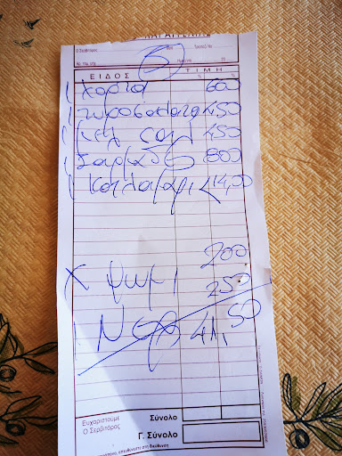 Read moreUnfortunately, we forgot that last year we ate here and weren't so pleased, so went again this year and left almost disappointed. It is a nice place, people are welcoming, you have where to park under the trees. One of the ladies raises her voice and sometimes you scare, instead of enjoying the calm atmosphere. The prices are too high for the small portions you receive and this is disappointing because it is tasteful. In the other tavernas you receive much bigger portions and they cost less. We paid 8 euros for 6 pieces of stuffed wine leaves (sarmadakia) and this is absolutely unpleasant. I expected at least double quantity for this price. Check the prices on the photo for what we ate. It was OK as tatse but very small quantities for what's the cost. Nice dessert...