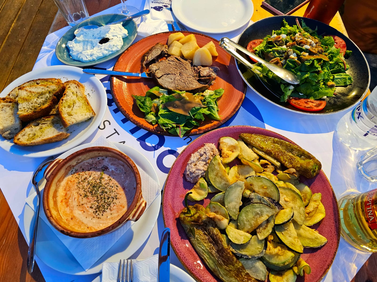 We didn't finish a part of our meal (grilled octopus) because it just wasn't good - chewy, tasteless. One of the waiters, an older gentleman, took it back to the kitchen without saying a word or asking if everything was alright with the dish when it's not finished (as one should). Since our table was greatly positioned for the purpose, I could see the corner of the kitchen on the left in the back of the restaurant, and I saw him eating it (possibly sharing with staff members) and shaking his head. It's an €18 octopus, so if it's not touched, it's clearly not because a person doesn't feel like eating it, after ordering. To my surprise, after this, nobody returned to us and we sat there on an empty table for 10-15 minutes before another waiter noticed us and served us the bill without saying anything. Another 15 minutes passed before a third waiter who just started his shift came to collect the bill with the question/statement "everything is good, yeah 👍". Everything was not good, but the manner it was handled in, tells me that nobody cares. All the while, the owner of the restaurant was sitting across from us in the inner hall. I could have asked to speak with him or just went over, but wanted to see how it's handled by the staff - disappointing, hence this review. Positives - the fish soup and salads (all of them!) are of excellent quality. The meat dishes were great - well prepared, tender and tasty. Sea food, both grilled and fried, wasn't good - we tried shrimps, mussels, calamari in different variations, and they were all chewy, too oily or mixed with vegetables and mushrooms that kill any other taste. The lady waiter with the short hair was very kind and attentive - a true professional, only she was too busy when...